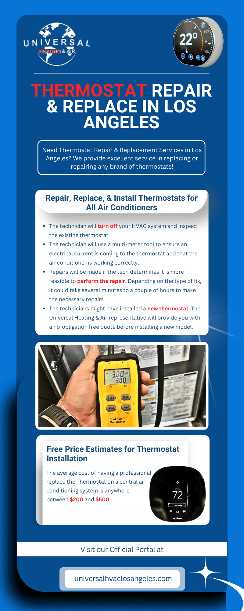 Universal Heating and Air are experts in residential and commercial HVAC servicing in Los Angeles, Orange County, and Ventura County for over 20 years. Our certified technicians can meet all your commercial HVAC systems needs 24 hours a day. Regular maintenance and repairs to your commercial thermostat replacement los angeles, including heating and cooling systems, will ensure it works at peak performance, which can save you thousands on your yearly utility bills.
